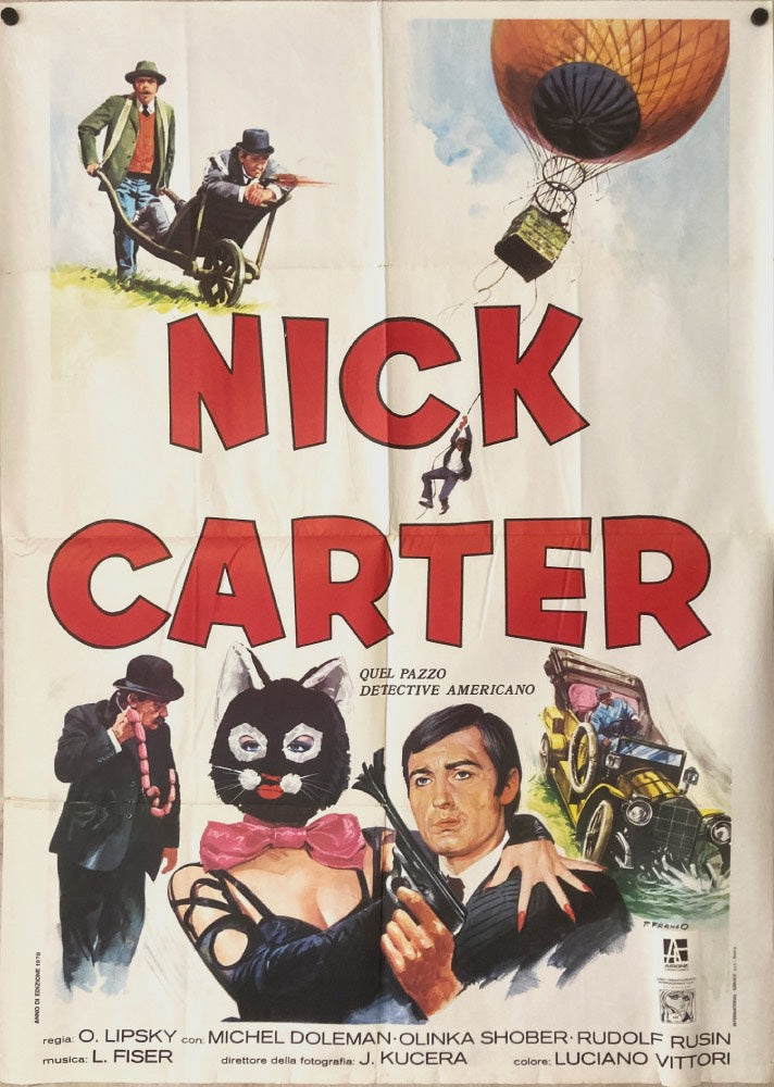 Beautiful Vintage Italian poster for Czech movie Adéla ještě nevečeřela (released in the U.S. as Dinner for Adele and in Italy as Nick Carter) is a 1977 Czechoslovak detective mystery–crime comedy directed by Oldřich Lipský. The film features Michal Dočolomanský (credited as Michel Doleman), Olga Schoberová (Olinka Shober), Rudolf Hrušínský (Rudolf Rusin), Miloš Kopecký, Václav Lohniský, and Ladislav Pešek.